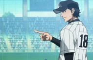 On the day of the match and Yakushi behind by four runs, Sanada replaces starting pitcher Mino in the bottom of the third, changing the mood of the team. With one out, a runner on second, and Masuko at bat, Sanada is determined to stop Seidou's momentum but ends up hitting Masuko's elbow guard, putting a runner on first. Sanada isn't bothered the least, throwing right to Miyuki's face next, but Miyuki dodges. He jams Miyuki with a cutter and the inning ends with a double play. In the bottom of the fourth and fifth innings, he continues to hold his ground against Seidou's batters.[3]