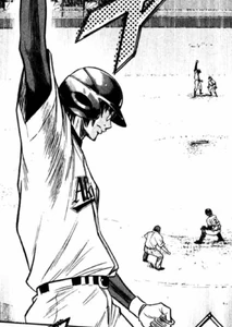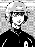 At game time, he discusses a strategy they can use against Furuya with his coach. When Furuya starts throwing strikes after a series of balls, Shunshin is impressed with Miyuki Kazuya's game leading.[6] At his at-bat, he briefly speaks to Miyuki and realizes that he has to take them down. He looks at his coach signaling that he's going for a hit. Shunshin swings at Furuya's pitch resulting in 2-RBIs. In the bottom of the first, he outs Kuramochi and Ryousuke, the latter out utilizing his precise pitching.[7]