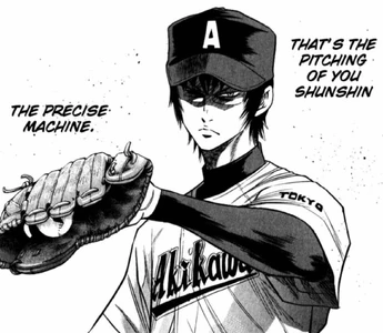 He stays behind to practice longer than anyone. His lust for sucking up knowledge about Japanese baseball is greater than anyones. He throws 200 pitches each day. He has an atmosphere around him, that doesn't let anyone close. However, inside him, he plays his pitches thoroughly while thinking of his parents, teammates and coach, showing that he thinks highly of them even so. He polished his ball control over days and got the nickname: "precise machine". His teammates, including the coach, are moved by his sincerity and passion towards baseball, trusting him quite a lot. Mine commented that at first, it looks as if the team is a one-man team led by Shunshin but the other players are also enjoying baseball to the fullest.